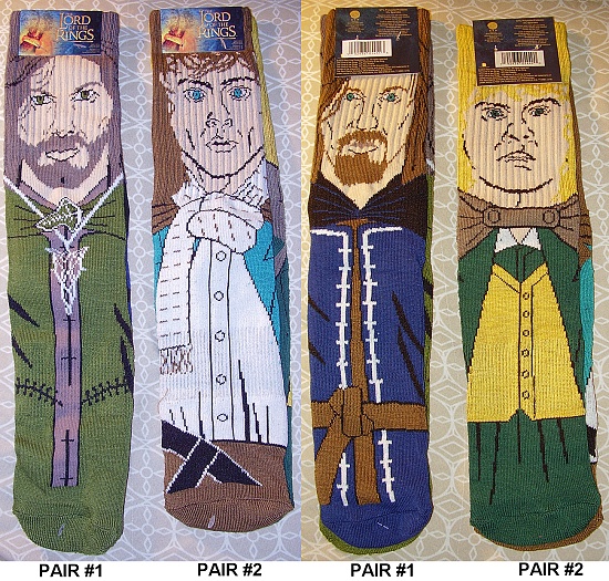 HYP The Lord of the Rings Aragorn & Boromir + Pippin & Merry Crew Socks - These two pairs of The Lord of the Rings crew socks, made by HYP in 2019, are interesting because they are not matching pairs. The first pair contains one Aragorn sock and one Boromir sock. The other pair contains one Pippin sock and one Merry sock. The faces on these are a bit on the ugly side, but for $2.50 a pair, I can't really complain much.