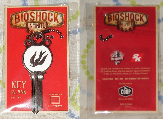 Bioshock Infinite Key Blank - Manufactured by The Coop, and released in Loot Crate's June 2016 "Dystopia" box, this "KW1/66" blank key features a bird on one side and an empty birdcage on the reverse. I've never played very far in my PlayStation 3 copy of Bioshock Infinite, so I don't understand what the bird and birdcage is in reference to. I already have a Phineas & Ferb house key, so I don't really need this. It'll go up on eBay to join the many others that are currently up there.