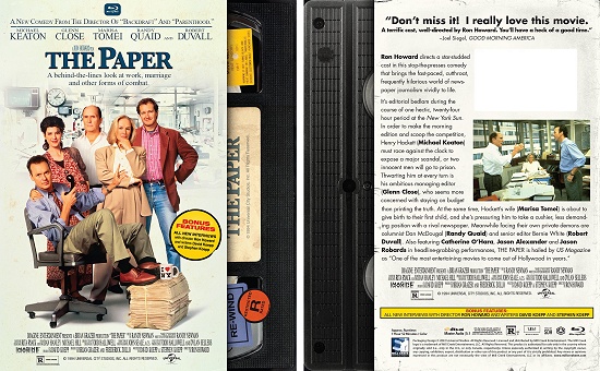 • SYNOPSIS: It's editorial bedlam during one hectic, twenty-four hour period at the New York Sun. In order to make the morning edition and scoop the competition, Henry Hackett (Michael Keaton) must race against the clock to expose a major scandal, or two innocent men will go to prison. Thwarting him at every turn is his ambitious managing editor (Glenn Close), who seems more concerned with staying on budget than printing the truth. At the same time, Hackett's wife (Marisa Tomei) is about to give birth to their first child, and she's pressuring him to take a cushier, less demanding position with a rival newspaper. Meanwhile facing their own private demons are columnist Dan McDougal (Randy Quaid) and senior editor Bernie White (Robert Duvall).