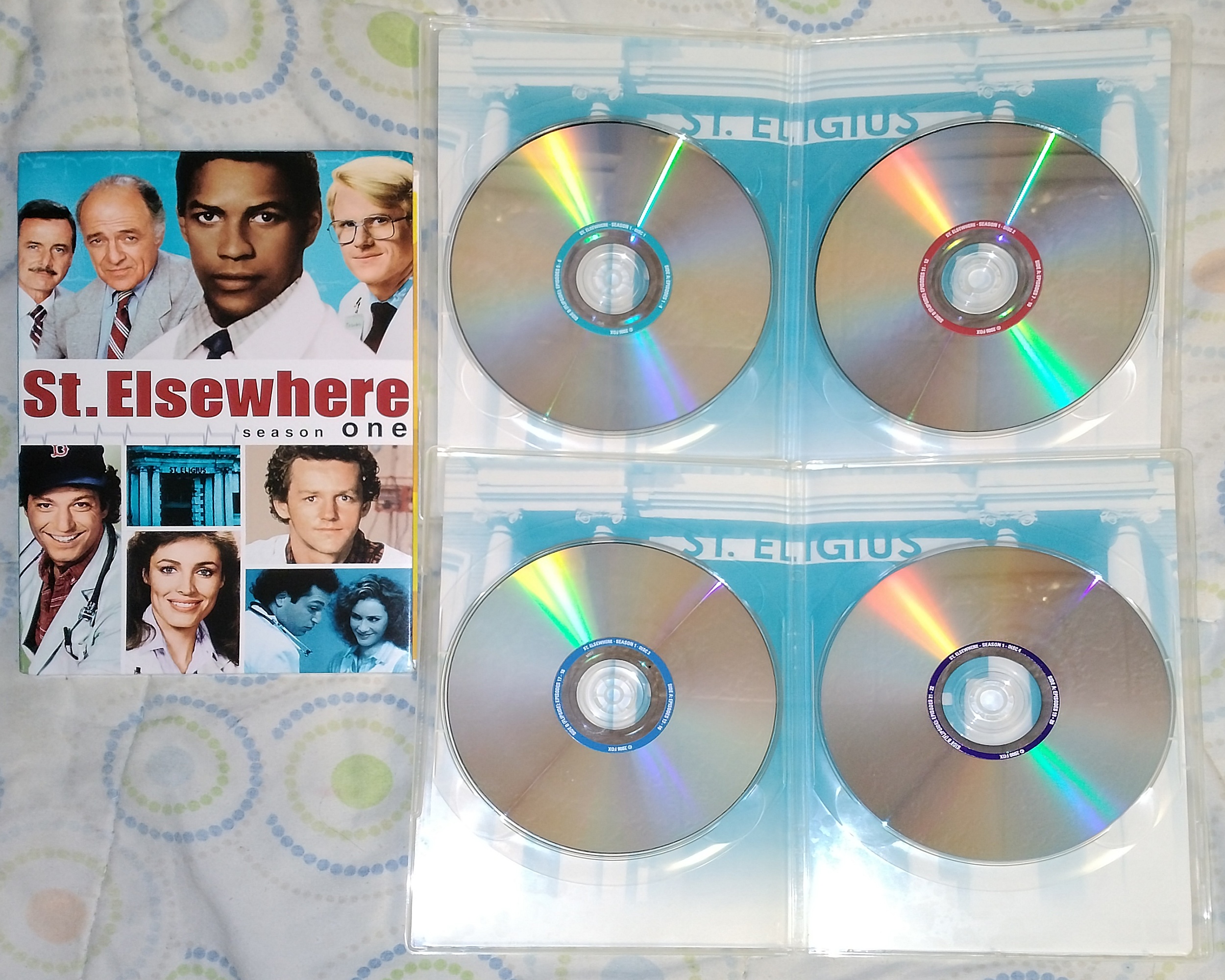 On November 28, 2006, Twentieth Century Fox released St. Elsewhere: Season One, containing twenty-two 50-minute episodes across four dual-sided discs. They are packaged in two slim cases, with two discs per, that slide into a side-loading slipcase.
