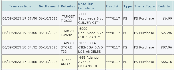 The June 9, 2023 thievery was three purchases of varying amounts (presumably) using a cloned card at two Target stores in California. Specifically, the Target at 1833 S. La Cienega Blvd. in Los Angeles, where a $87.96 purchase was made at 18:04:32 Eastern (6:04 pm). The thieves then went to the Target at 6000 Sepulveda Blvd. in Culver City, where at 19:36:55 and 19:37:50 Eastern (7:36 pm) they made two additional purchases in the amounts of $27.95 and $6.99. By the time they were done, I was left with just $3 and change in my account.