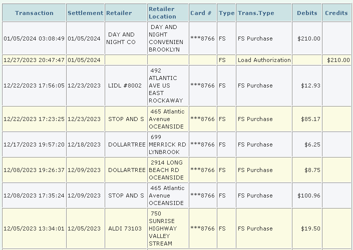 While it's possible that my card was skimmed again at one of the stores I shopped at in December - Aldi (Valley Stream), Stop & Shop (Oceanside), Dollar Tree (Oceanside), Dollar Tree (Lynbrook), Lidl (East Rockaway) - my belief is that Day and Night Convenience II Corp. is in on the theft. An owner, manager, or employee had to purposely input a false purchase into the register in order to take the entire whole dollar benefit amount. It is very rare that a purchase at *any* store would come out to an even dollar amount. The odds are even more astronomical that the even dollar amount would be MY ENTIRE BENEFIT AMOUNT TAKEN ON THE DAY THAT THE BENEFIT BECAME AVAILABLE FOR ME TO USE. The thieves had to either have known when and how much I would be getting, or were checking the balance every day starting on January 1st, since they knew that people get their benefits within the first week of the month. Also, I don't think that anyone legitimately spends over $200 on food at a convenience store.