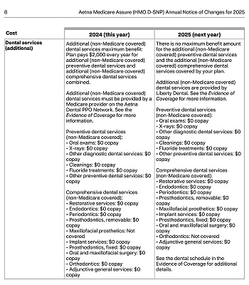 Just as insulting is that Aetna did not send out any high-profile mailings specific to this dental plan change. You know, something with large, colorful text flanked by photos and clip art illustrations that would bring this FUCKING HUGE IMPORTANT CHANGE to everyone's attention. Remember, these D-SNP plans are targeted towards senior citizens, as evident by all of the photos of old folks in the quarterly newsletters I get; which also did not mention this change. Most members of the target audience are NOT going to notice this small change on the member card. Nor will they notice the brief, nearly hidden mention of the plan change in the "Annual Notice of Changes for 2025", a 20-page black-and-white all-text generic-looking book that was mailed out to members a month or two ago. The change is mentioned half-way through the book on Page 8, and as seen in the image below, is easy to miss. I sure didn't notice that it now says "Liberty Dental", and if a member didn't even look at this book and just tossed it aside when it was mailed to them, they definitely wouldn't have known about this FUCKING HUGE IMPORTANT CHANGE. Have I made it clear that this is not a change that should be buried in a mound of text?