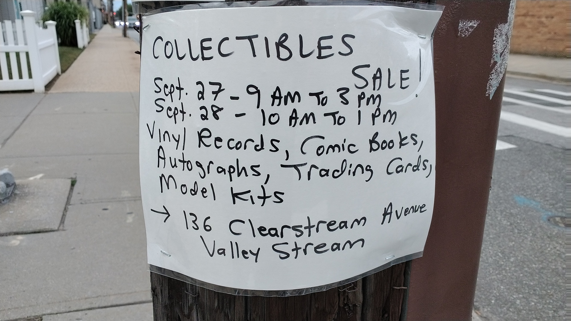 A few days before, I saw a sign posted at the corner outside the Valley Stream post office for a "Collectibles Sale!" at a house at 136 Clearstream Avenue. It advertised vinyl records, comic books, autographs, trading cards, and model kits. This sounded right up my alley.