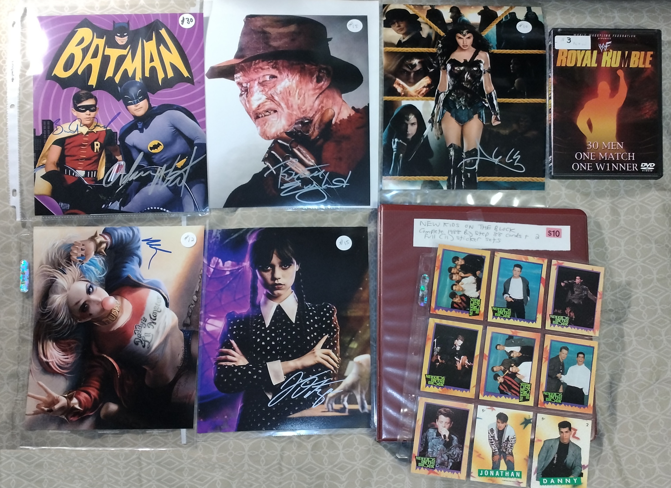 The Topps New Kids on the Block (1st Series) card & sticker set (from 1989), and WWF Royal Rumble 2002 DVD (Koch Canadian release), are both legitimate items. The five autographed photos are fake and should be discussed further.