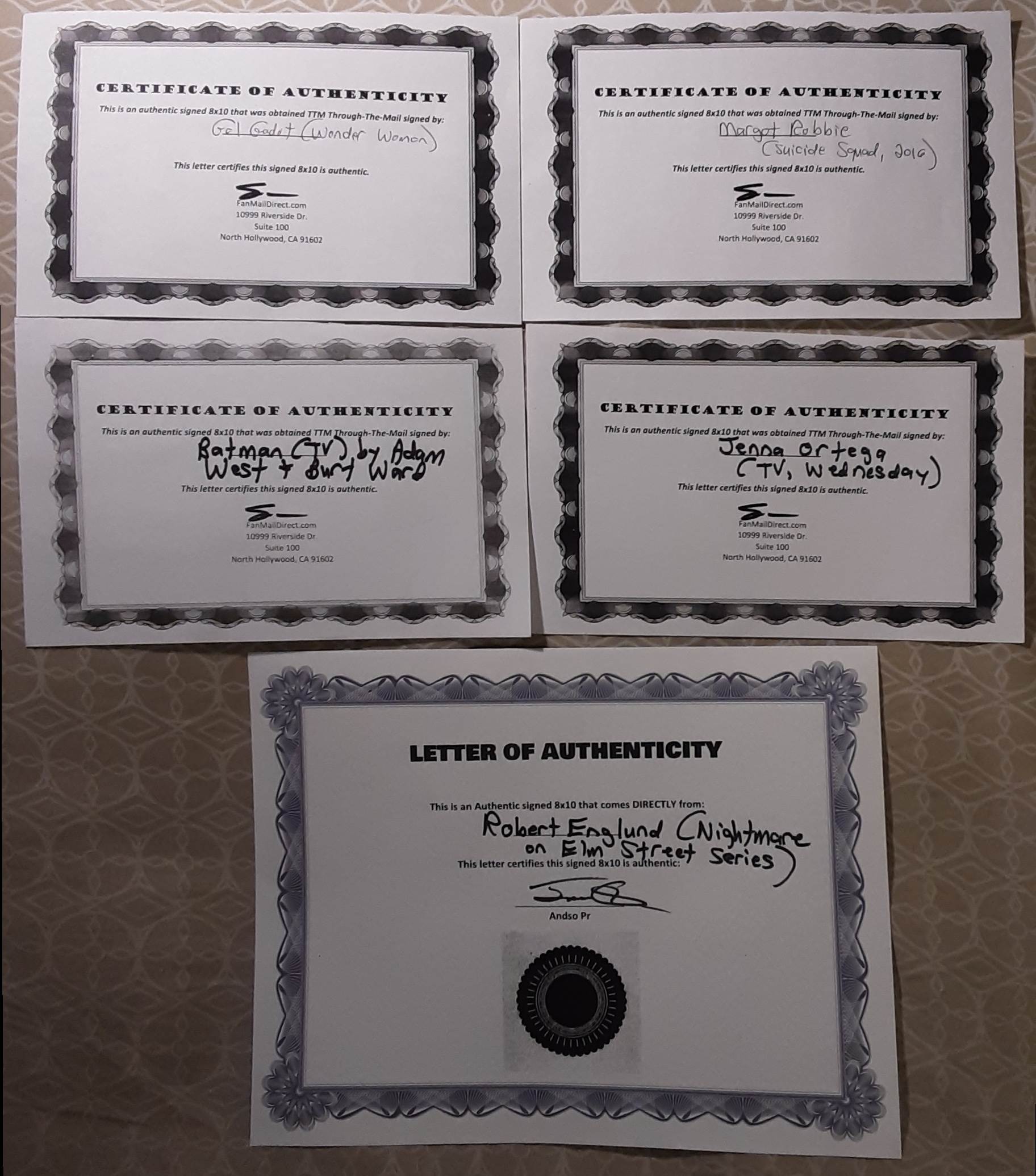 Anyway... Fan Mail Direct seems to have gone out of business. There is no longer at website at FanMailDirect.com. An archived copy of the site from July 2023 only shows minor B-list and C-list celebrities (including Ghostbusters' Ernie Hudson!); no one on the level of Gal Gadot, Margot Robbie, or Jenna Ortega. It really makes me wonder why all of these photos have COAs from Fan Mail Direct.