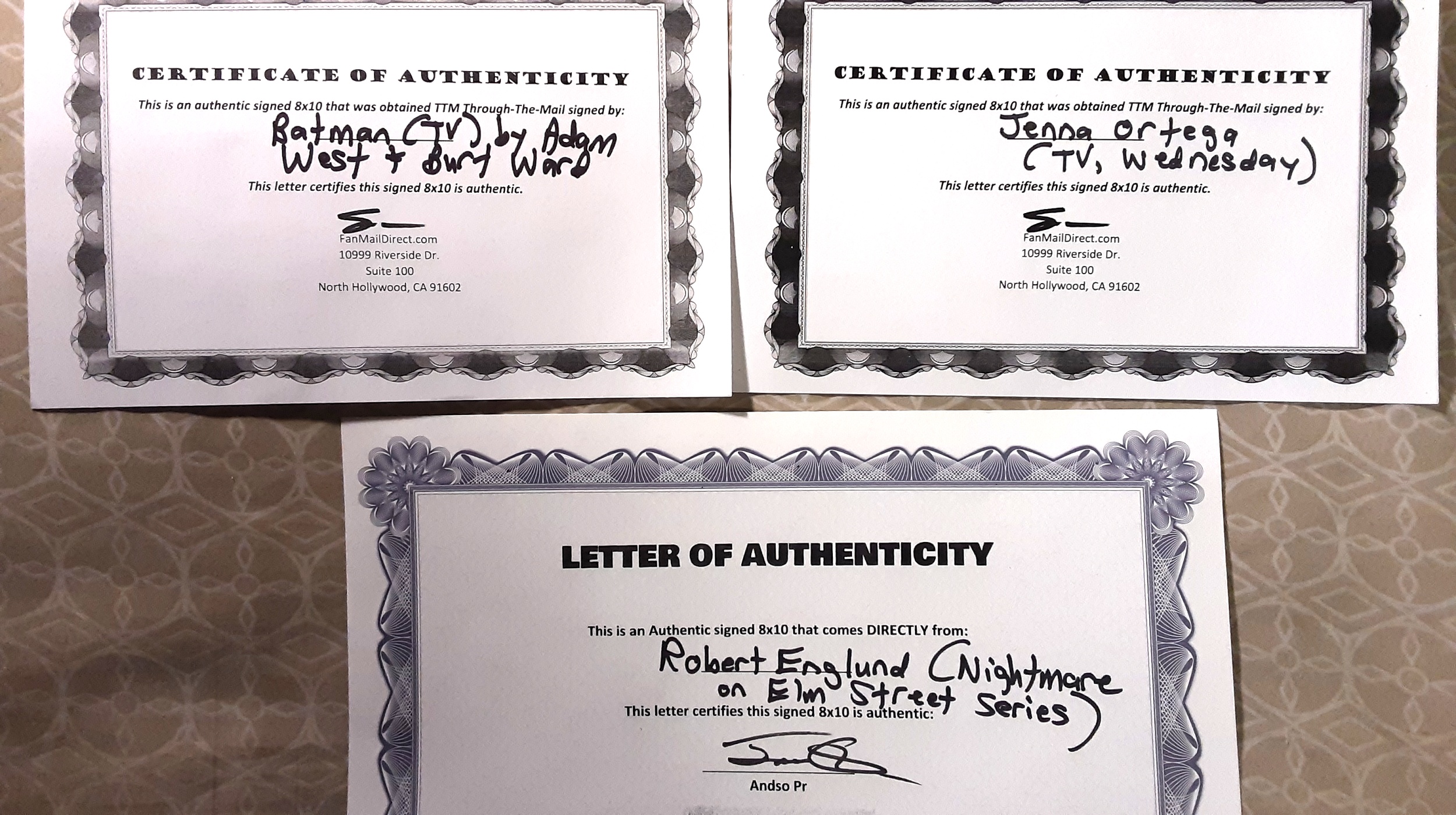 Reading the details of the COA reveals another red flag of fraud. All of the Fan Mail Direct COAs state that the photo is "an authentic signed 8x10 that was obtained TTM Through-The-Mail signed by [insert name here]". This makes me laugh. By their very nature, autographs obtained through-the-mail are near impossible to legitimately authenticate. A proper authentication service - such as JSA, PSA, or Beckett - would have to know a history of the celebrity, such as if they actually sign through the mail or have secretaries sign for them, and then have legit examples of their signature to compare it to in order to do an authentication.