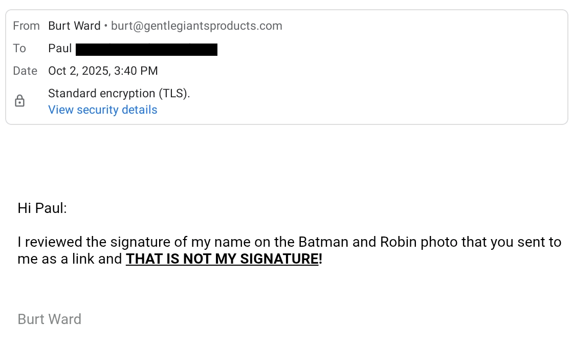 Taking this one step further, I e-mailed Burt Ward through the e-mail address (burt@gentlegiantsproducts.com) listed on his pet food company website (also this one). Within minutes I received a reply confirming that that is NOT his signature on the photo I bought. Can't get any better authentication than that!