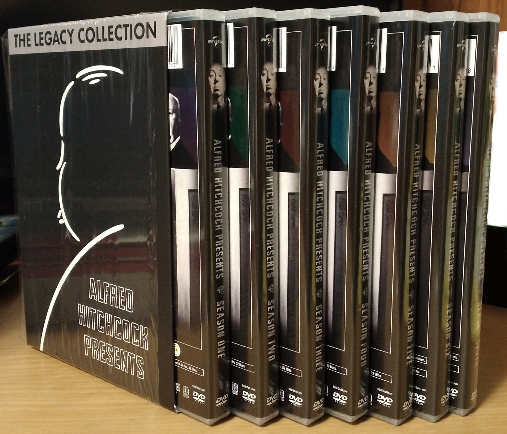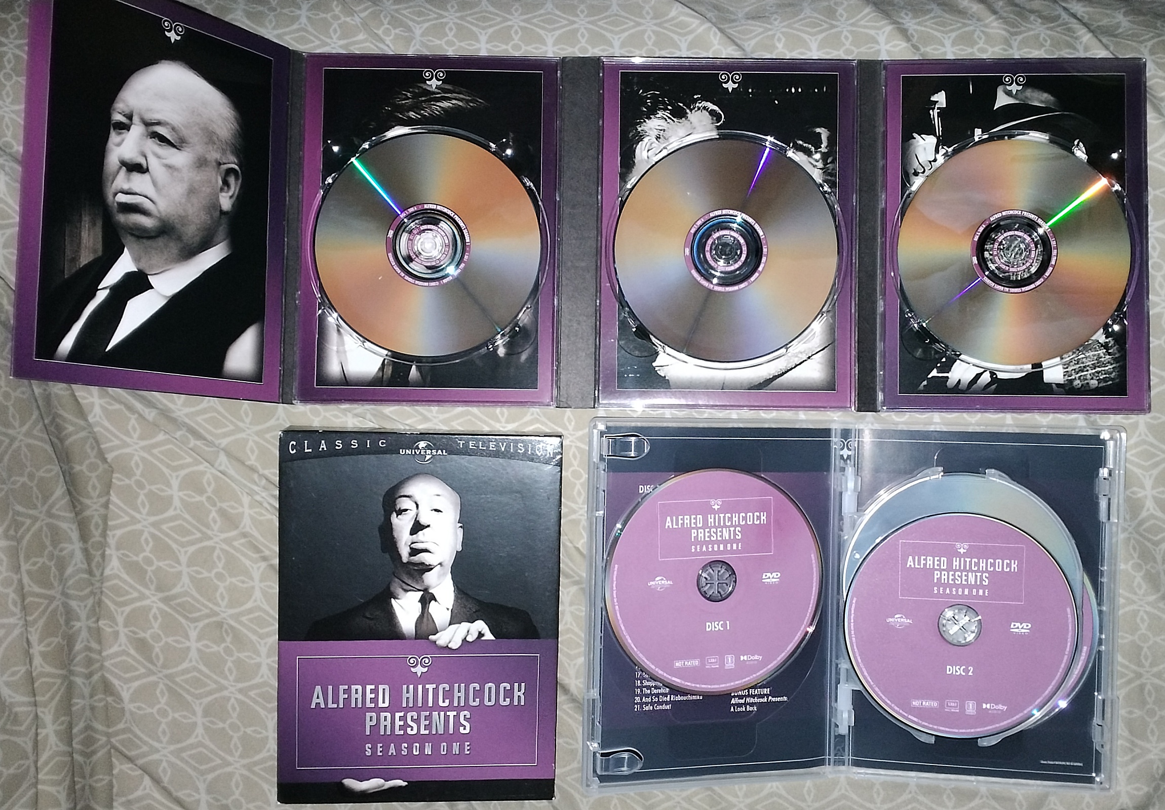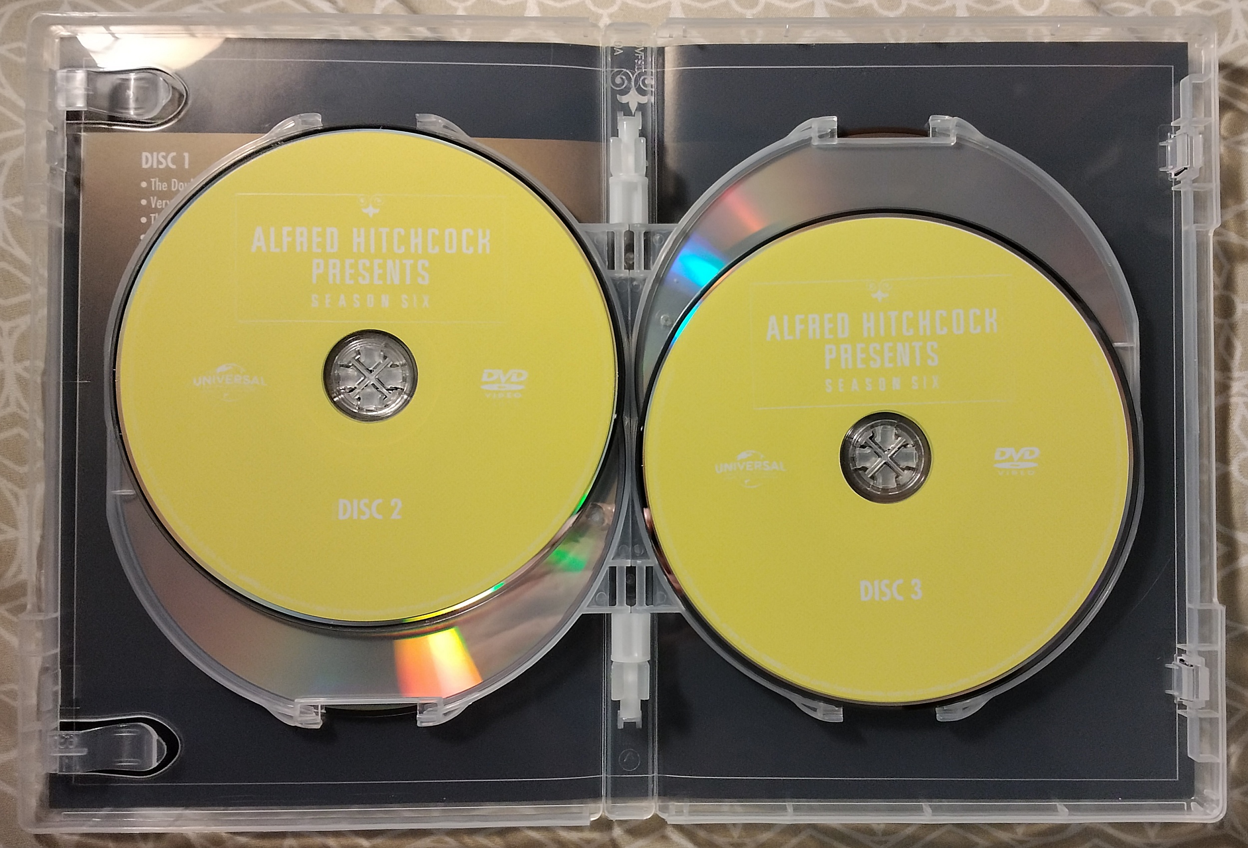 These are the same disc masters that were originally released as dual-sided discs in fold-out digibook packaging about 20 years ago. They have now been repressed as single-sided discs. For example, the original Season 1 set was three dual-sided discs, but now it's six single-sided discs, as seen in the photo below Universal did this for The Munsters (reviewed here) and Kolckak: The Night Stalker a few years ago, and other series, I'm sure. I'm happy to see Universal do this, instead of authoring new discs with more episodes crammed per disc and extras lost (like Warner Brothers did for many series, such as Dukes of Hazzard and Thundercats). I'm also happy to see them replace the crappy and irreplaceable-if-broken Digibooks with standard plastic cases.