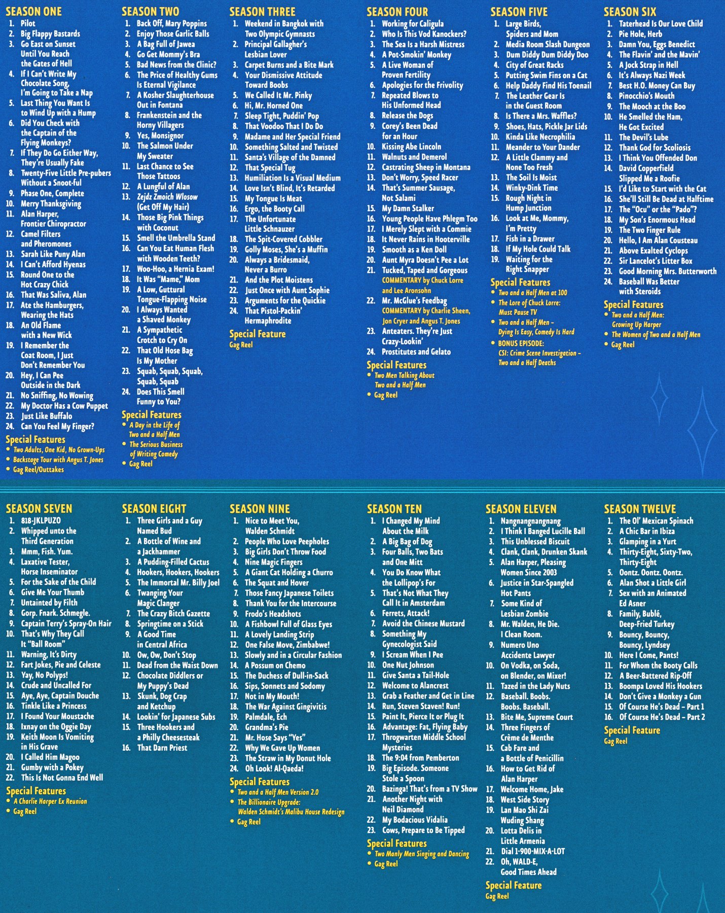 - SEASON 06: The Women of Two and a Half Men (15:45) - A focus on female cast members and their characters, with comments from Charlie Sheen, Jon Cryer, Angus T. Jones, Chuck Lorre, Lee Aronsohn, Conchata Ferrell, Holland Taylor, and Marin Hinkle.