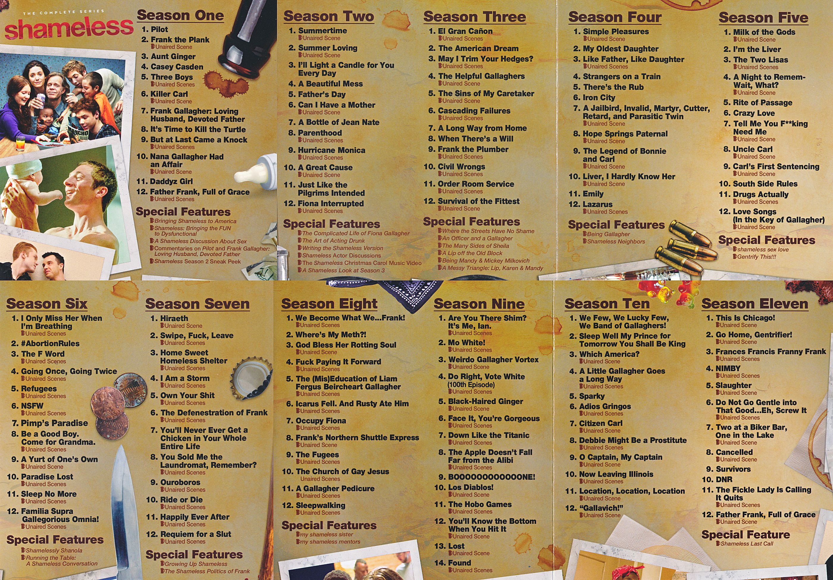 Shameless (U.S.): The Complete Series is available on Blu-ray and DVD. I watched the entire series first run on Showtime, and besides the nice female nudity - from Emmy Rossum (multiple episodes), Laura Wiggins (s01e04 "Casey Casden"), Nichole Bloom/Sakura (s05e08 "Uncle Carl"), and others - the show is enjoyable (in a twisted way) as the story of Chicago's most dysfunctional functional family. I noted this as "U.S." because it's actually a remake of a 2004-2013 U.K. series with the same name (that also lasted 11 seasons).