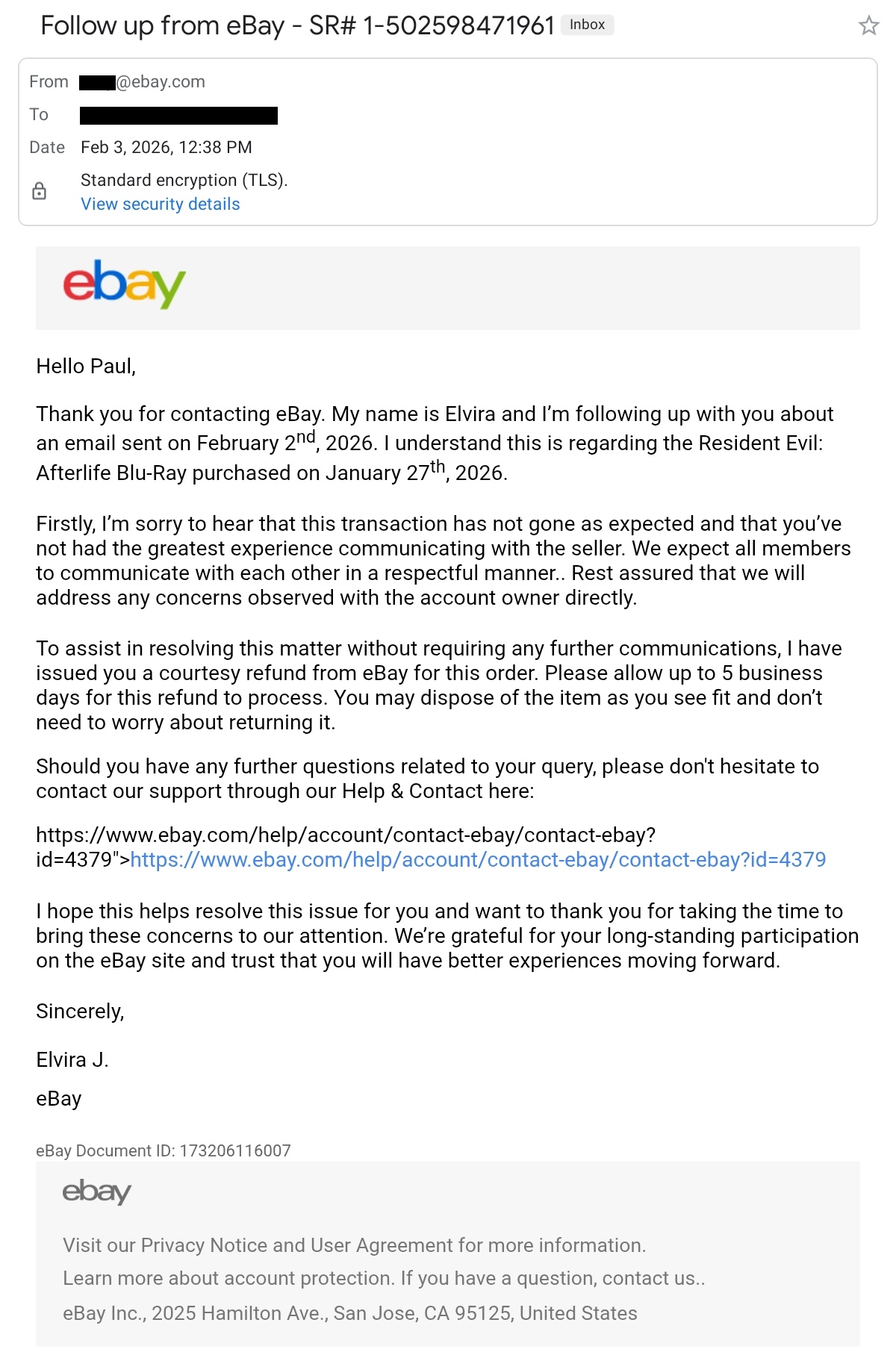 At this point, I realized that I was dealing with a mentally unstable individual who would not handle this properly. So, I had to contact eBay's executives to make things right. On February 3rd, I received a reply from Elvira J. of the eBay president's office. Although she got the name of the Blu-ray wrong - I can see why she would make that mistake because Brian's listing is VIOLATING eBay policy by listing multiple DIFFERENT items/SKUs in the same listing as "variations" - she did refund my original $9.78.