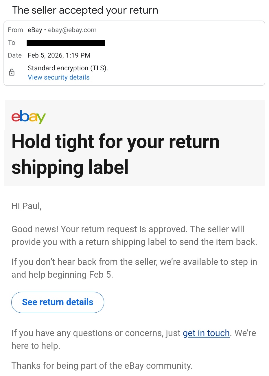 In addition to giving me the refund, she stated, "You may dispose of the item as you see fit and don't need to worry about returning it." At this point, I considered the matter closed. I wasn't going to have any more interactions with Brian West, and was just going to let the matter go. I guess Brian couldn't because on February 5th, he actually approved my return request?!? You know, the action he should have taken a week earlier instead of slinging insults at me.