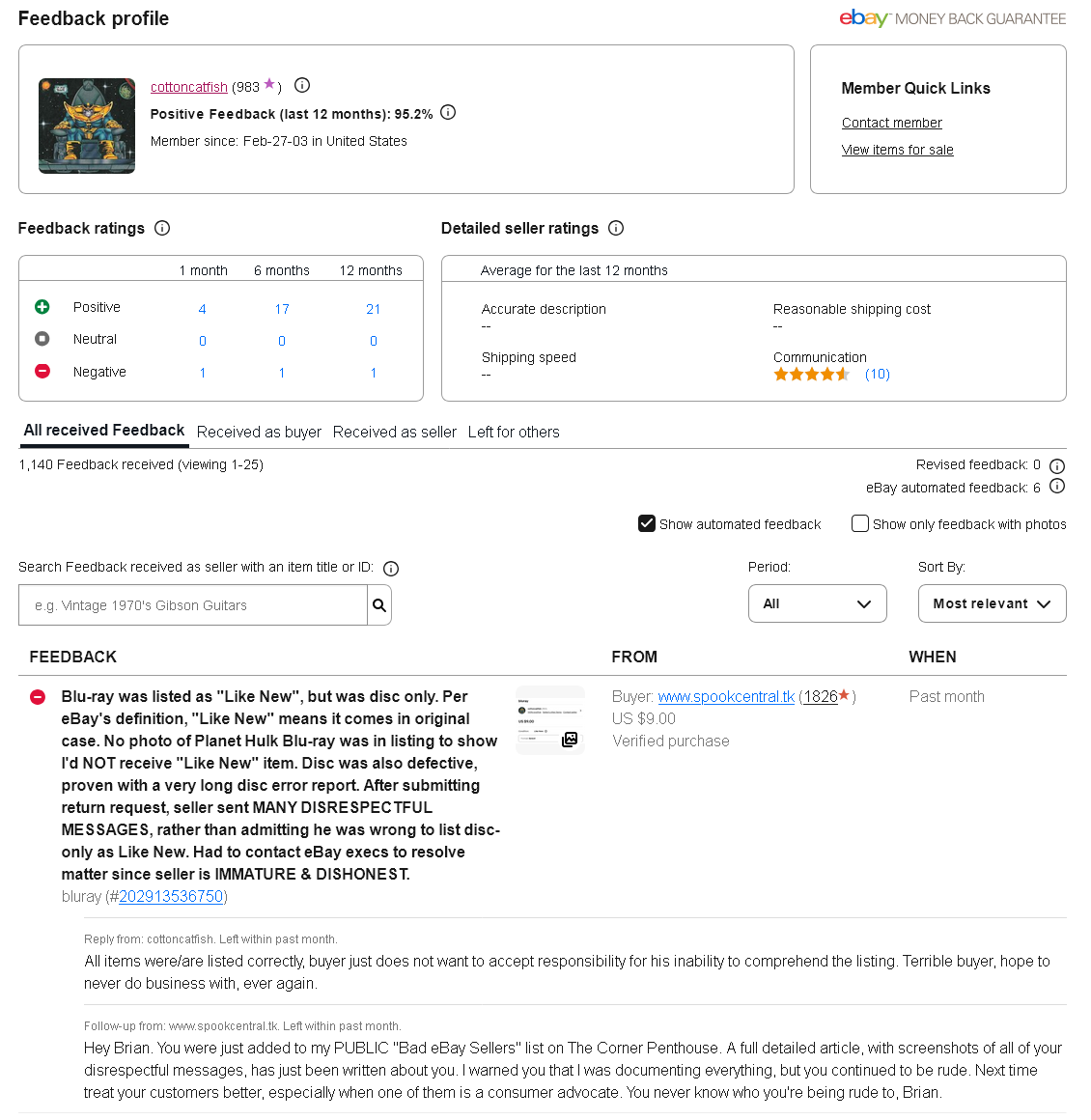 This is another in a series of articles about eBay, who covers up the deceitful business practices of its sellers, while turning its feedback system into an utter joke. I will do my best to inform the public about eBay's scummy practices and the bad sellers that operate on the platform, so other buyers can avoid them. The bad seller I will be writing about today is Brian West of La Vergne, Tennessee, operating under the eBay ID: cottoncatfish