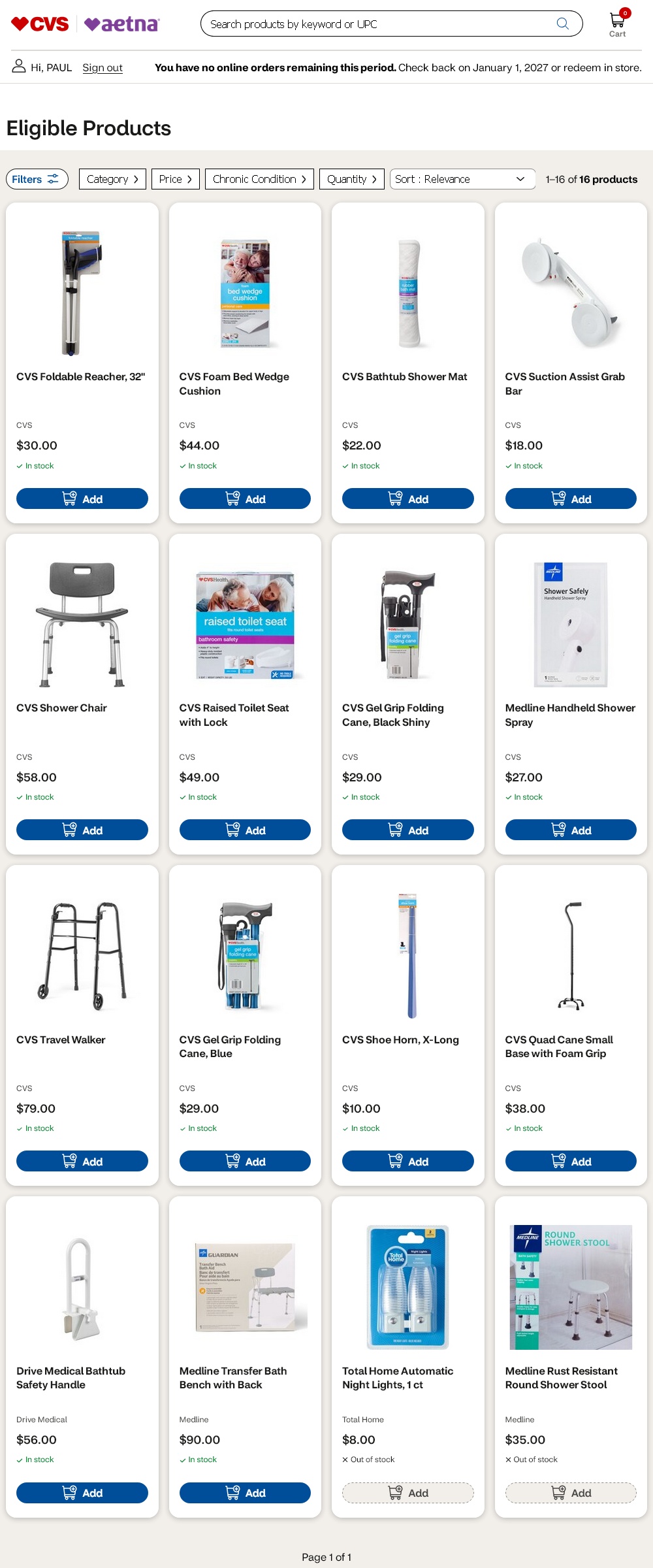 When you log into the Aetna/CVS online store, you are shown the screen above letting you choose between the Fall Prevention benefit and the Extra Benefits Card (and Rewards). This choice determines which wallet(s) you can shop with. If you select Fall Prevention, you will be allowed to use the $150 to buy a measly 16 overpriced items, as seen in the screenshot below. Yes, that's EVERY item you can buy with this benefit, and some will likely be out of stock.